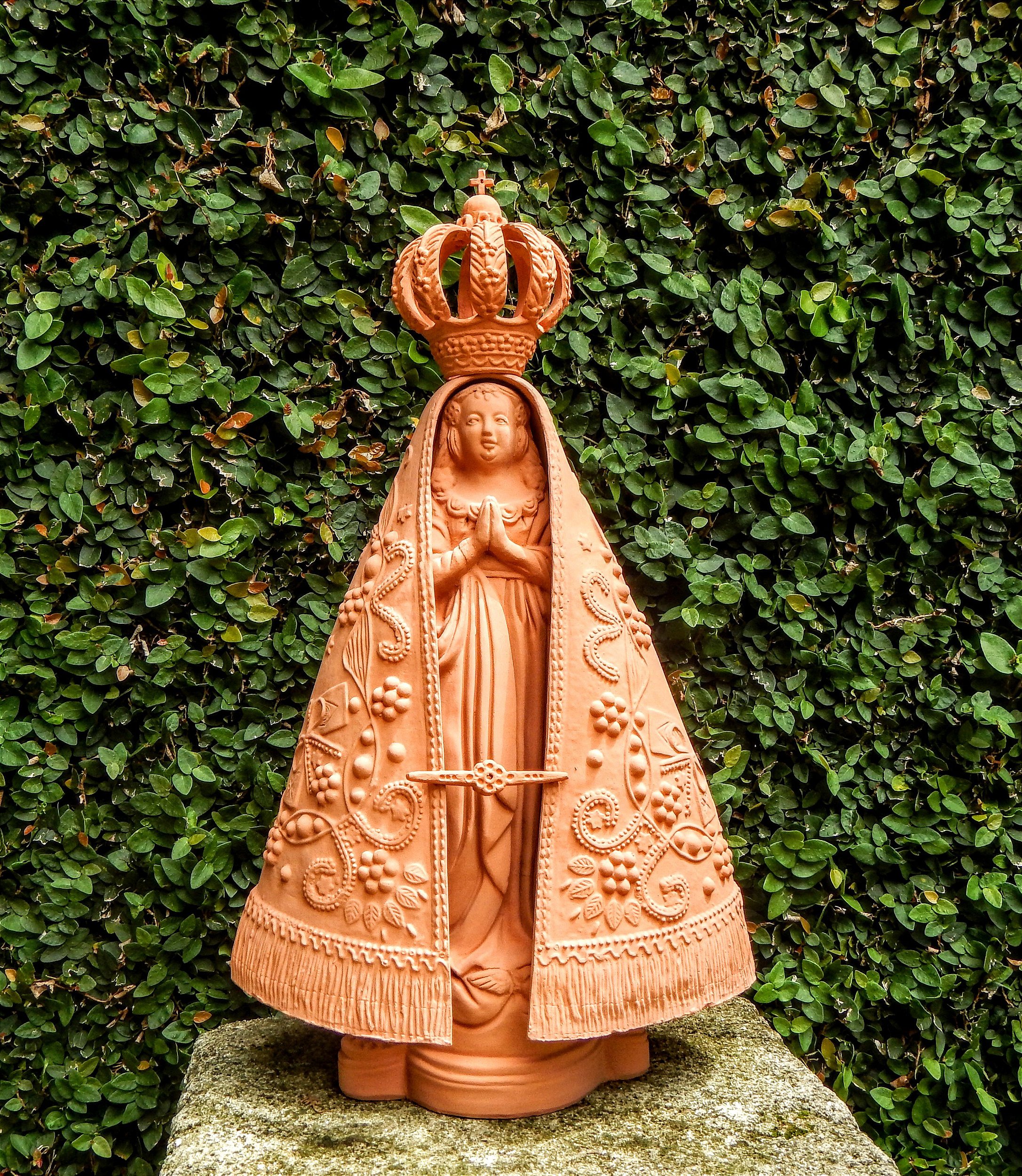 Imagem de Nossa Senhora Aparecida é esculpida em terracota inclusive seu manto, coroa e broche.